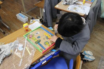 図工科では、金づちで釘を打つ感触を味わい、いろいろな打ち方を試しながら釘を打ってできる形を見つけ、形などの感じ方を捉えながら工夫して表す学習をしています。コリントゲームのボードに金づちで釘を打っていきました。安全補助具を活用して、上手に釘を打っています。