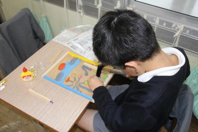 算数科では、三角形の学習をしています。この日は、正三角形や二等辺三角形を見分け方について考えました。コンパスを使って辺の長さを測り、その他の辺を比べて見つける活動を行いました。コンパスの使い方に慣れてきました。