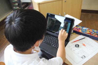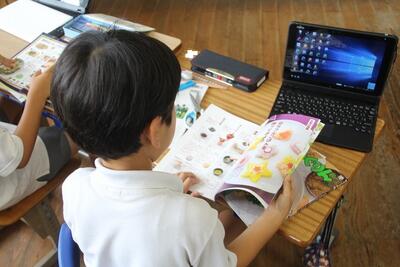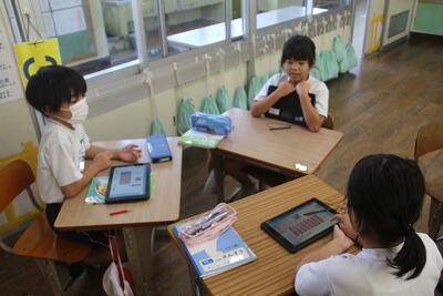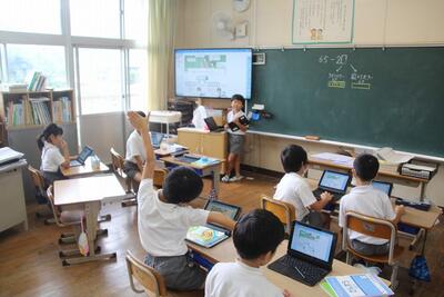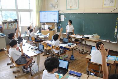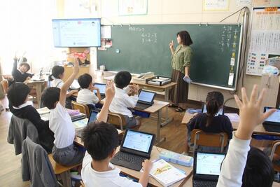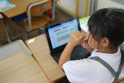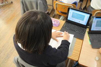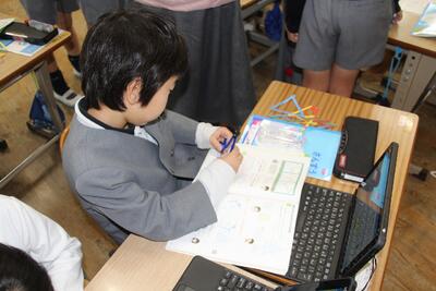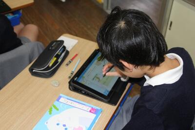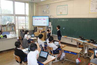 算数科では、小数のたし算やひき算について学習しています。「0.8-0.2」について、0.1がいくつ分あるのか整数に置き換えて考えました。タブレットPCに入力し、みんなの考えを共有して正解を探しました。情報共有アプリの使い方に慣れて、自分たちの力で進める3年生です。