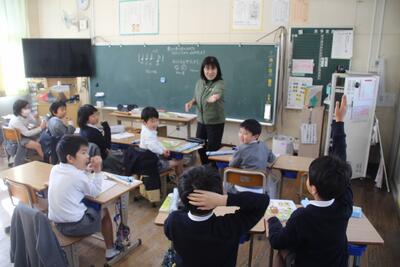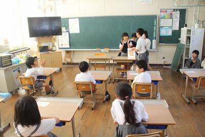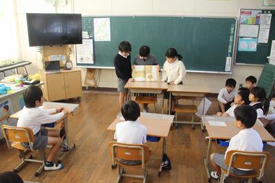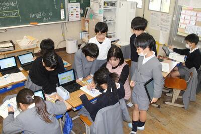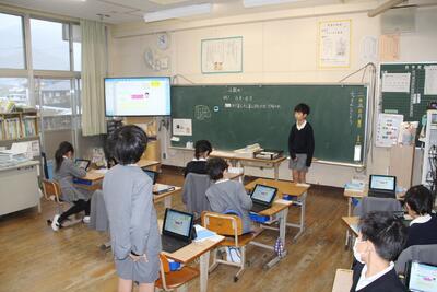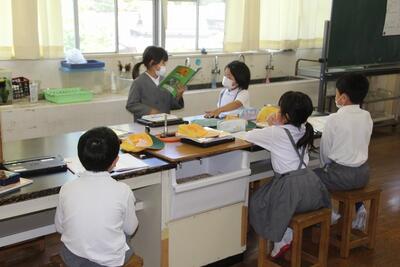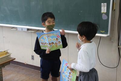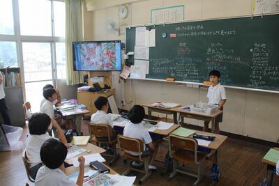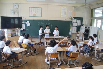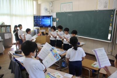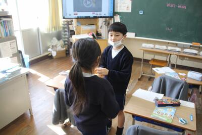 国語科では、わたしたちの学校じまんについて1・2年生に発表しました。人のつながりの強さのこと、給食のこと、自然豊かなことなどについて、スライドを使って分かりやすく伝えました。発表後には1・2年生から感想のお返しがあり、とても喜んでいました。
