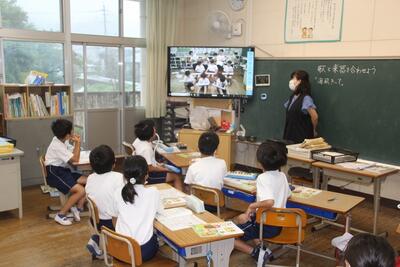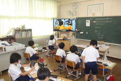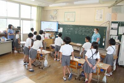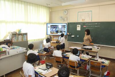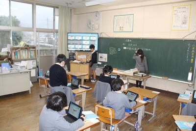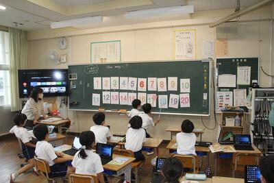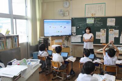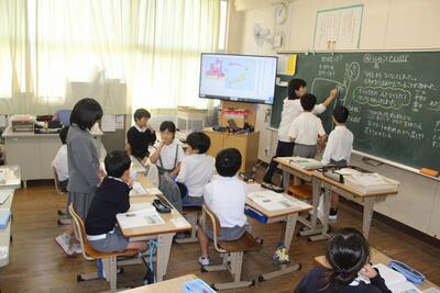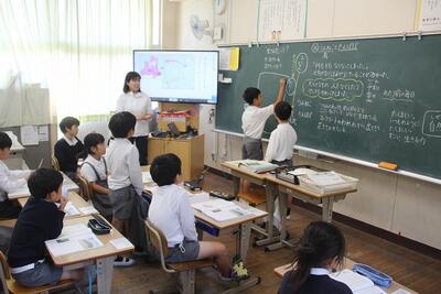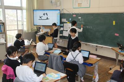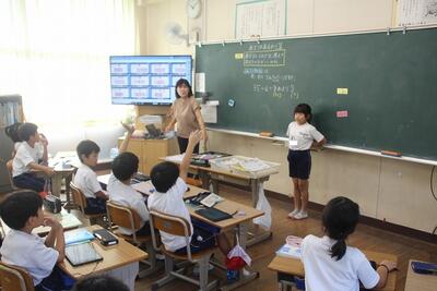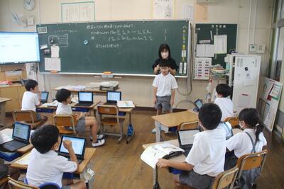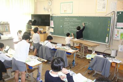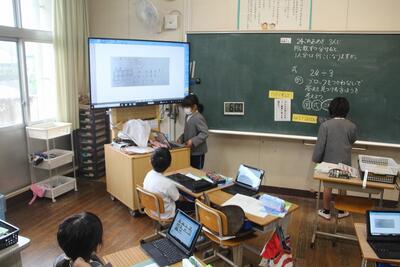 算数科では、1人分を出したり、同じ数ずつ分けたりするわり算の学習をしています。この日は、はやく簡単に求めるわり算の方法を考えました。自分なりのやり方をモニターに映し出して説明しました。説明の仕方が上手になっている3年生です。