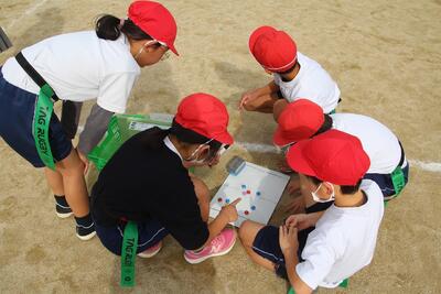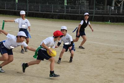 体育科では、ゴール型ゲーム「タグラグビー」の学習をしています。タグラグビーはボールを持って走り、相手をかわしたり、パスをしたりしながらゴールに向かってトライ(得点)をする運動で、 タックルの代わりに相手のタグ(腰につけたはちまき)を取って守りまます。4つのチームに分かれて、チームのめあてや個人のめあてをたて、ゲームを中心に学習をしています。学習はじめはボールより前の位置にいる人にパスをして反則になることがありました。だんだん慣れてきて、ボールを持った人より真横か後ろにいたりパスをしたりすることができるようになってきました。タグラグビーの楽しさを味わっています。