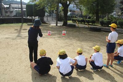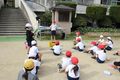 体育科では、ハンドボール型ゲームの学習をしています。コンテナの上に三角コーンを置き、そのコーンを的にして攻撃側が半径3mの円の外側からボールを投げてそのコーンがコンテナから落ちたら得点、守備側は半径1mの円の外側から3mの円の内側でシュートを阻む、攻撃側3人・守備側2人というルールで、ゲームを楽しんでいます。シュートのミスはボールを失うことになるので、パスをつないでマークが外れたときにシュートを確実にねらうことをがんばっています。ボールを持たない人の動きが学習のポイントです。