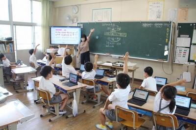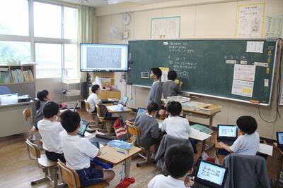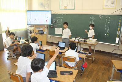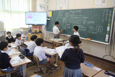 算数科では、一億までの数の仕組み・よみ方・かき方を理解し、十進位取り記数法のよさについて学習しています。この日は、都道府県の人口を比べていました。自分の考えをタブレットPCに入力し、その画面を見せながらグループで話し合いました。タブレットPCでは、拡大や縮小が簡単にできるので、説明を聞く側は分かりやすいです。