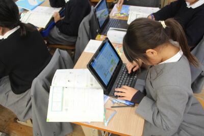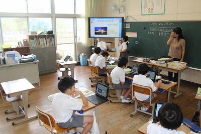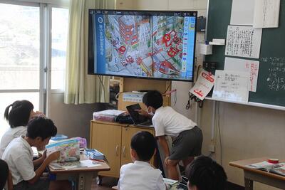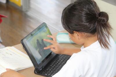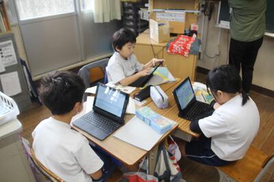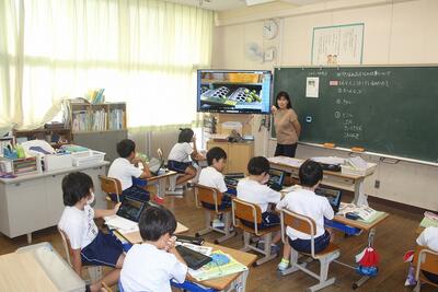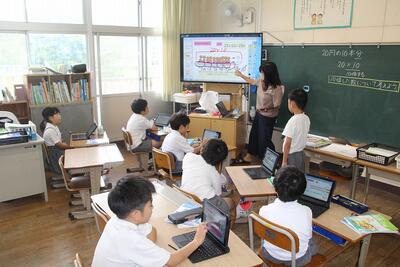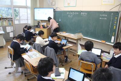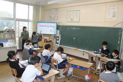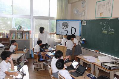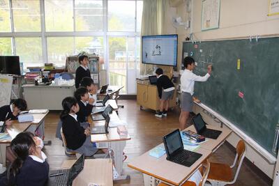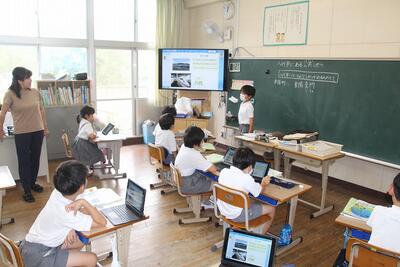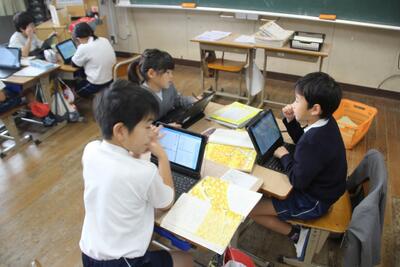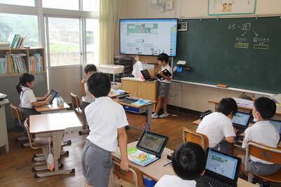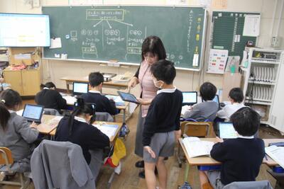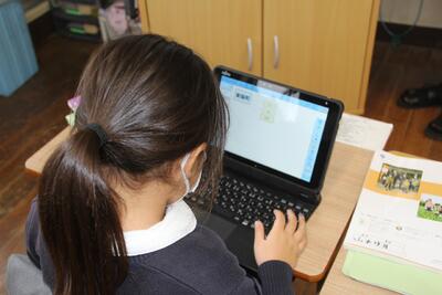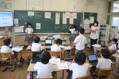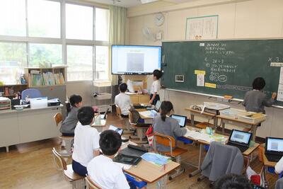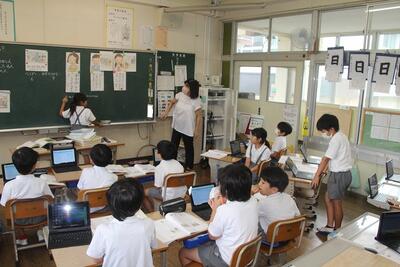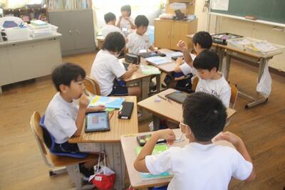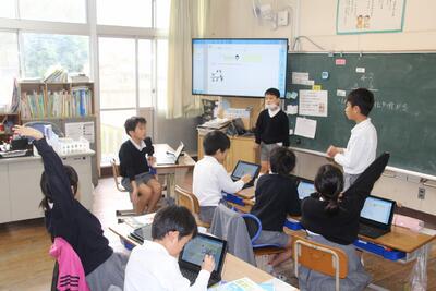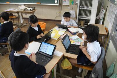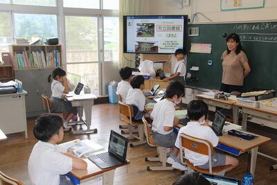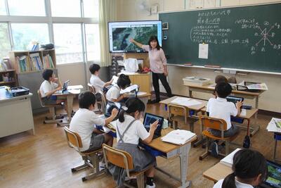 社会科では、市のうつりかわりについて学習しています。この日は、タブレットPCを使って、八代市の人口の変化を調べました。八代市全体の人口の変化や、八代市と合併する前の東陽村の人口を調べたりしました。これから八代市の様子や人々の生活の様子などについて、調べまとめる活動を行います。