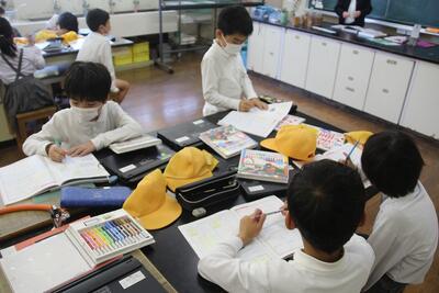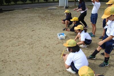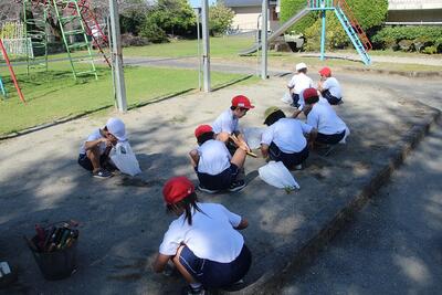 理科では、「しぜんのかんさつ」という学習を行いました。校庭の生き物を虫めがねで観察し、色や形・大きさなど姿に違いがあることや、えさやすみかなど共通することなどについて見つけました。ノートにまとめ、みんなで調べた結果を共有しました。
