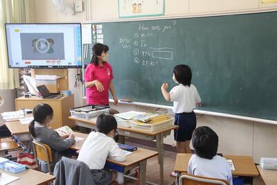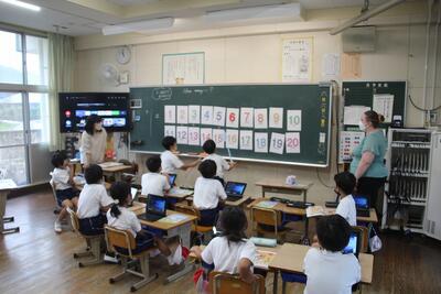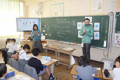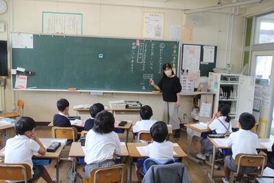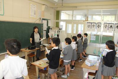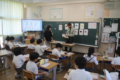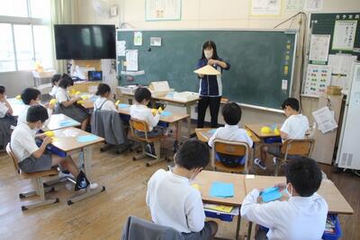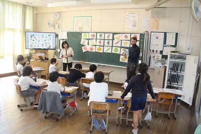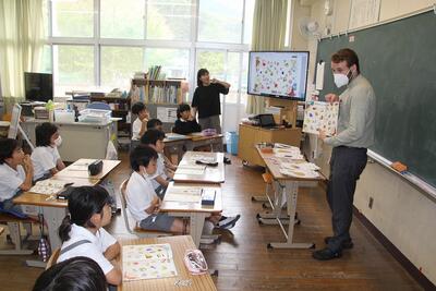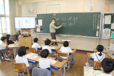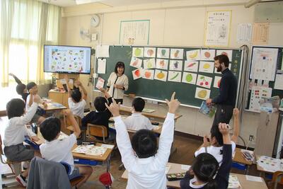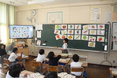 外国語活動では、"What's this?"という単元を学習しています。この日は、クイズを出して果物や野菜・食べ物などを答える学習でした。ヒント1果物、ヒント2黄色、ヒント3サルというようにスリーヒントを英語で出して、英語で答えるやりとりを行いました。はじめはALTのJ先生のクイズに答え、その後はみんなで尋ねたり答えたりして、楽しく活動しました。