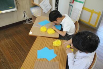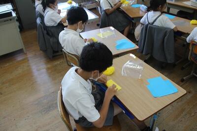 運動会では、1~4年生で花笠音頭を披露する予定です。この日は、その花笠に付ける紙花作りを行いました。これまでに紙花を作った経験がある3年生なので、黙々と作っていました。運動会当日は、美しい花笠の動きにも注目してしただければうれしいです。