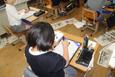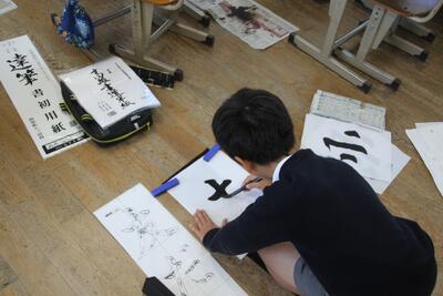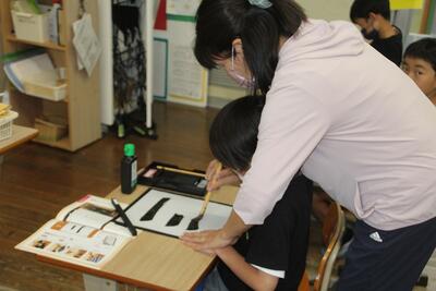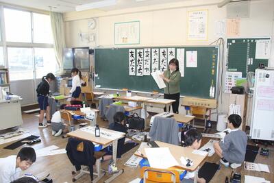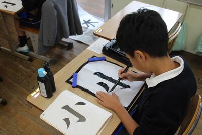 国語科の書写では、書写展に向けて、毛筆で小型条幅紙に「友だち」と書きました。漢字とひらがなのバランスや、「友」の右はらい・左はらいなどに気をつけて練習をしました。1月の書写展に向けて、がんばっています。