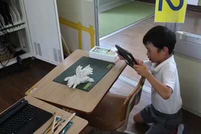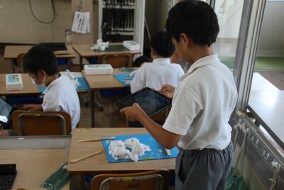 図工科では粘土を使って立体に表す学習を行いました。今回のポイントは、用具を使って切ったりかき出したりすることを行うことでした。自分が考えたことを粘土で表現しました。作品が完成すると、タブレットPCで撮影し、提出フォルダに入れていました。図工科でもICTが活躍しています。