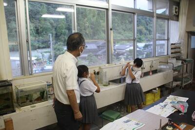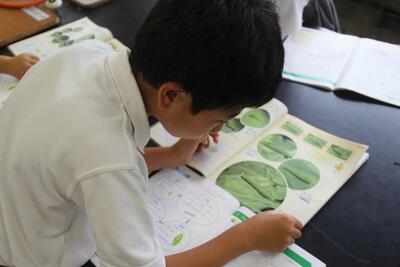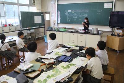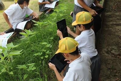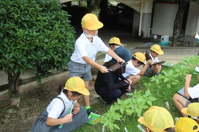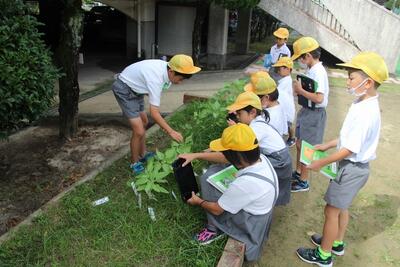 理科では、植物の育ち方(葉・くき・根)について学習しました。この日は、ホウセンカを観察して、植物の育ち方の順序、根・くき・葉のつき方について、ものさしで長さを測ったり、タブレットPCのカメラ機能で撮影したりしました。夏休み明けにはどのように変化するのか楽しみです。