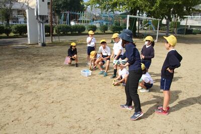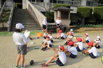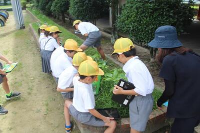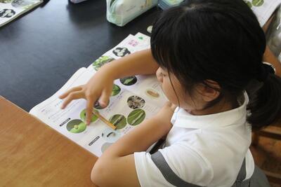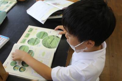 理科では、こん虫の育ち方の学習を行いました。キャベツを植えてそこにやってくるモンシロチョウが卵を産み付け、その卵が幼虫から成虫になるまでの観察を行いました。成長の順序を理解し、生き物を大切にする心を育んでいます。