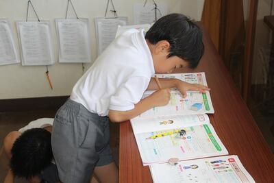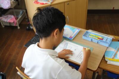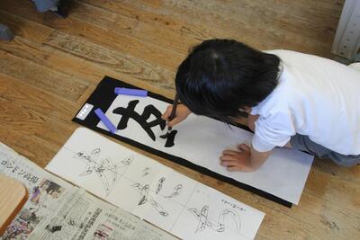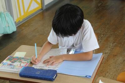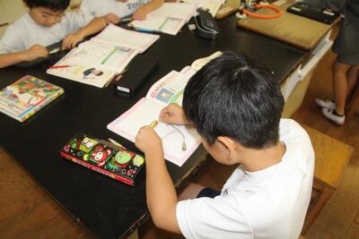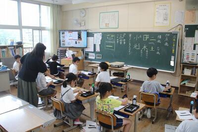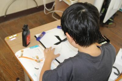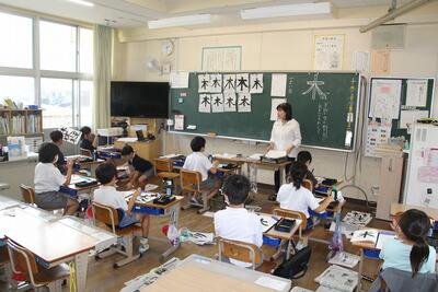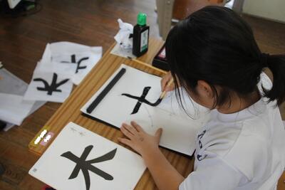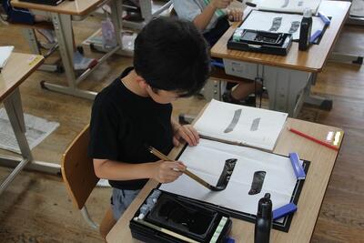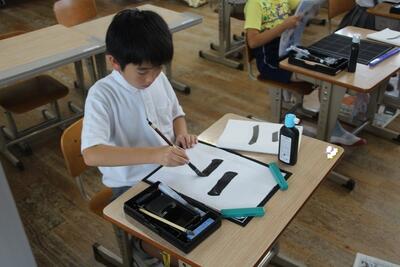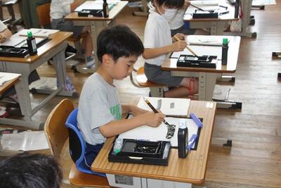 3年生から新たに学習することの一つに毛筆(習字)があります。この日は3年生が初めて毛筆を使って書きました。横画の筆先の角度や始筆・終筆に気をつけながら丁寧に書き進めました。これからどんどん上手になっていく3年生です。