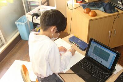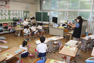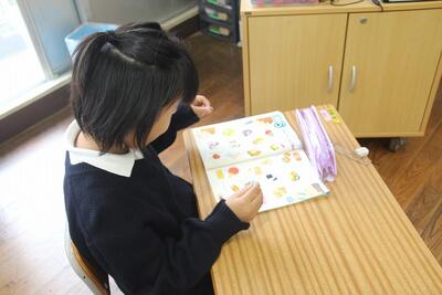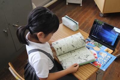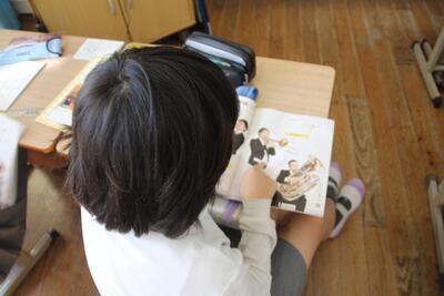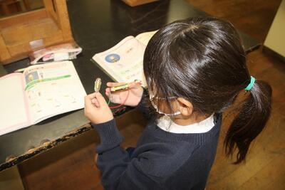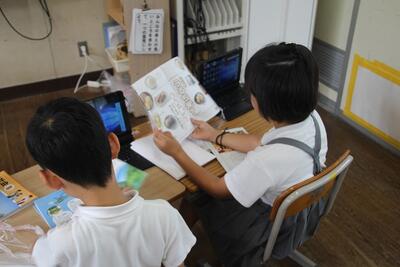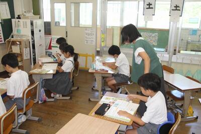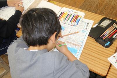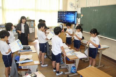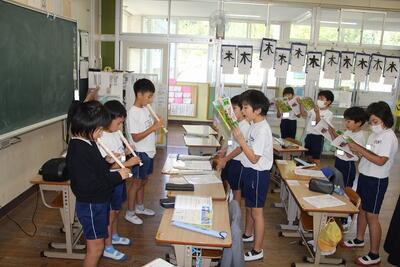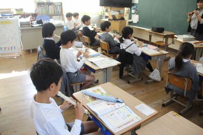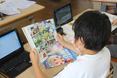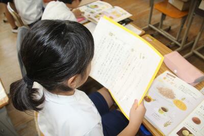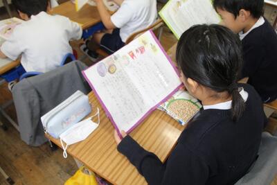 国語科では、説明文「すがたをかえる大豆」を使って、「れい」の書かれ方に気をつけて読み、それを生かして作文を書く学習をしています。この日は、児童が題材を選んで書いた「食べ物へんしんブック」の完成が近づいていました。小麦・牛乳・たまご・魚・いも・とうもろこし・野菜などの食べ物について、どのようなものに変わっていくのかをまとめてきました。早く読んでみたいです。