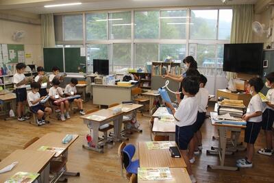 音楽科では、歌って音の高さを感じとる学習をしています。「海風きって」という曲を使って、歌ったりけんばんハーモニカで演奏したりして、音の高さを感じとっています。この日は、自分たちの歌や演奏をタブレットPCで撮影し、確認しました。3年生が音楽を楽しんでいる様子がとても伝わってきました。