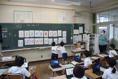 外国語活動では、数字の学習をしています。この日は、ALTの先生の発音を聞き取り、1~20のカードを取り合う活動を行いました。直接手で取り合うとけがをする恐れがあるので、ハエたたきでカードを取り合いました。チーム対抗のゲーム形式だったので、3年生が熱くなっていました。教室の中の熱気がさらにアップしました。