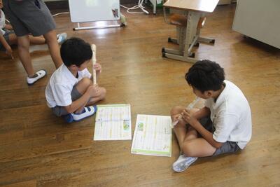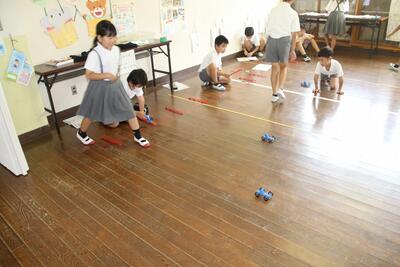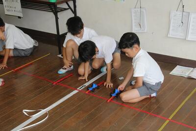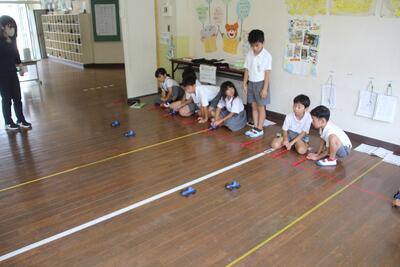 理科では、ゴムや風の力について学習しています。この日は、ゴムの力で車を動かす実験をしました。ゴムの力と車が動く距離との関係について調べました。また、遠くまで車を動かすには、ゴムをどのようにすればよいかも合わせて考えました。実験結果についてしっかり記録をとる3年生です。
