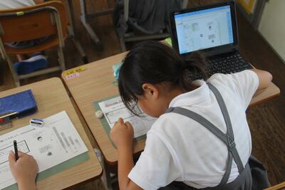 国語科では、詩を味わおうという学習を行いました。「わたしと小鳥とすずと」「夕日がせなかをおしてくる」を使って、感じたことや考えたことなどを出し合い、感じ方の違いについて学習しました。タブレットPCに自分の考えを書き込み、その後、考えの共有を行いました。学習リーダーが進め方に困ったとき、周りのみんなが支えてくれる3年生です。
