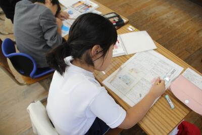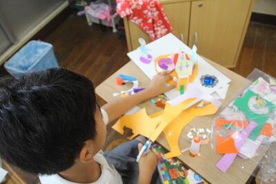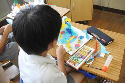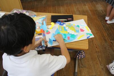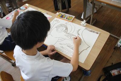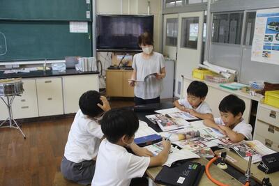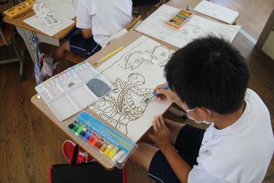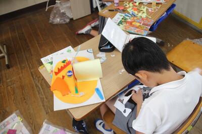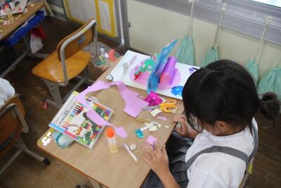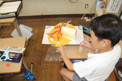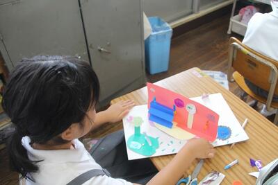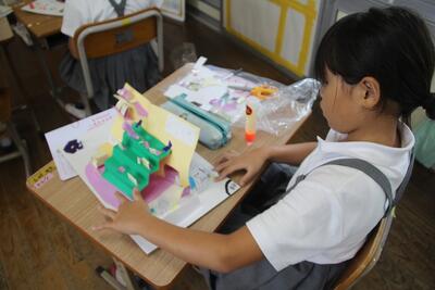 7月14日に紹介した図工科の続報です。「くるくるランド」という台紙に割りピンを付けて、回る仕組みを使って作品を作りました。1年生で学習した紙を折ることや、2年生で学習した紙を重ねることを活用していました。学習の積み重ねがよく見えた作品作りでした。