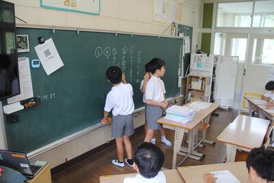 算数科では、あまりのあるわり算を学習しています。この日は、あまりを切り上げて答えを処理する学習でした。「8脚あまり3人」から「9脚」になることをみんなで考えました。わり算にある「あまり」について深く考えました。