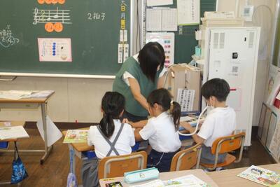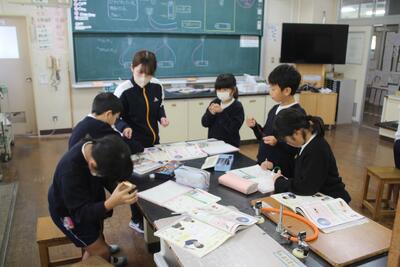 理科では、電気の通り道を学習しています。この日は、乾電池と豆電球を使って、明かりがつくつなぎ方や明かりがつかないつなぎ方について実験しました。豆電球が光ったとき、子どもたちの表情も明るくなりました。