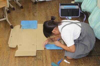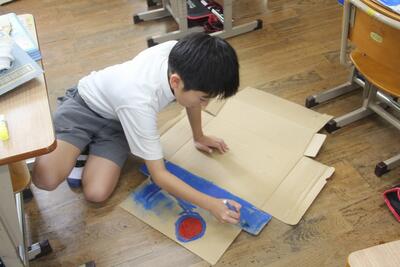 図工科では、段ボールを開いたり立てたりしながら、思いついた考えを形や色で表現する学習を行いました。段ボールに絵の具を筆やスポンジ・ローラーなどで色づけしました。どんな作品が完成するのかとても楽しみです。