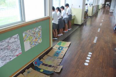 社会科では、まちの様子について学習しています。この日は、学校から南に広がるまちの様子について調べました。方位磁針を使って北の方角を確認しました。学校の南側には東陽町の中心部で、東陽支所やJA東陽支所・郵便局などがあり、みんなの暮らしを支えている施設などが多くあります。
