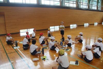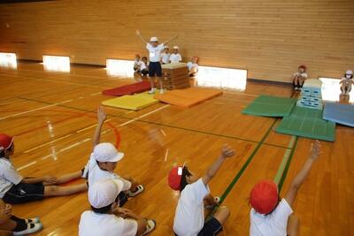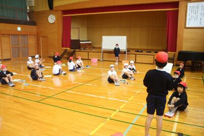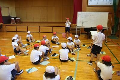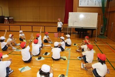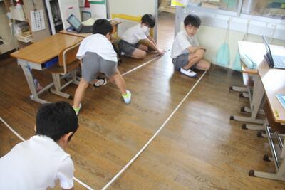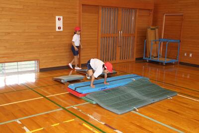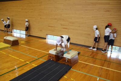 体育科では、とびばこ運動遊びで台上前転を練習しています。自分のめあてに合った場で練習を行い、最後に技の習得状況を確認しました。手足や体の伸び・なめらかさ・着地の3つの視点で、ジャッジをしました。3つともに合格している人が出ました。振り返りでは、自分や友達のよかったところを学習リーダーを中心にして伝え合いました。