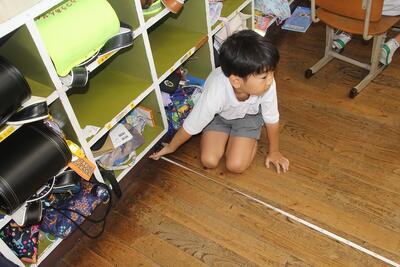 算数科では、長さの学習をしています。この単元では、長さの単位「㎞」の理解、長さの加減計算等を学習します。この日は、長さを測定する巻き尺の仕組みや測定方法を学習しました。0を合わせることやまっすぐ伸ばすこと、目盛りのよみ方などの説明を受けて、実際に教室の縦や横などを測定しました。測った長さはタブレットPCへ入力しました。巻き尺で測りながら長さの量感をつかんでいきます。