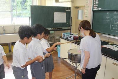 理科では、音の出方や伝わり方について学習しています。この日は、音の大きさによってものの震え方の違いを小太鼓を使って実験しました。震え方を可視化するために、小太鼓の上に小さいビーズを置き、その動きを調べました。音のふしぎを学習しています。