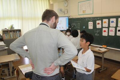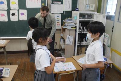 外国語活動では、色・スポーツ・飲食物・果物・野菜など自分の好みを伝え合う学習をしています。この日は、自分の好みの色を伝え合う学習をしました。ALTのJ先生から英語での発音や言い方を聴いて、伝え方を理解しました。その後、ペアになって、“I like red.” “Wow ! Beautiful!”など英語でのやりとりを楽しみました。