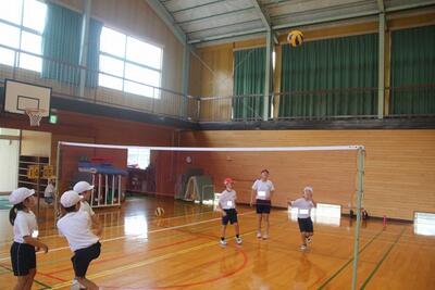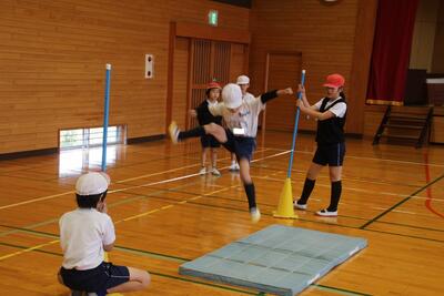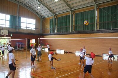 体育科では、ネット型ゲームを学習しています。キャッチしてもOKというソフトバレーボールで、コート上のポジションや、ボールを持たない人の動きについて、考えながら活動しています。相手コートに強いボールを返すことが児童の魅力になっています。