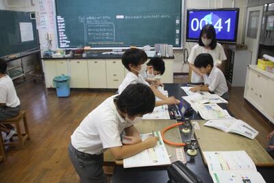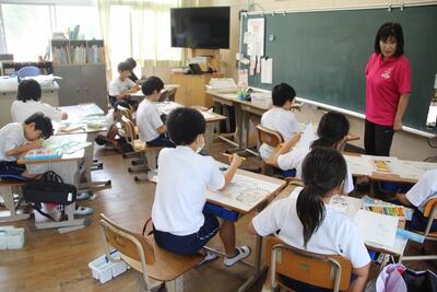 学活では、1学期末にキャリアパスポートの記入を行いました。1学期を振り返って、目標設定シートの自己評価と、1学期の成長と頑張りを見つめました。2年生との複式学級での学校生活、学習リーダーを中心にした授業、隅々まできれいにした掃除など、1学期によく頑張った3年生です。