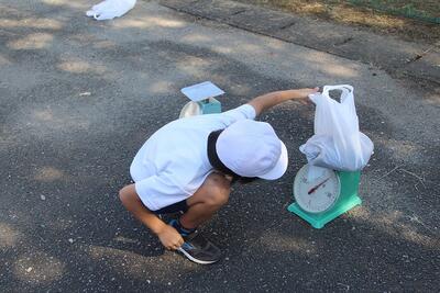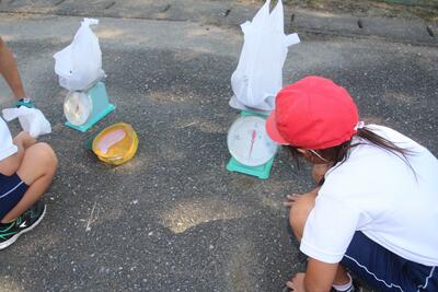 理科では、ものの重さについて学習しました。この日は、身近にある物の重さについてはかりを使って調べました。スポンジ・わりばし・紙コップ・鉛筆・乾電池などを測りました。単一乾電池の重さにびっくりしました。