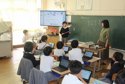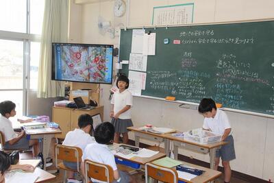 社会科では、「はたらく人とわたしたちのくらし」という学習をしています。この日は、農家の仕事の中でみかんを栽培されている保護者を取材した児童の発表を行いました。タブレットPCで撮影したみかんを選別する様子の動画をみんなに見せてくれました。仕事の様子がよく分かりました。