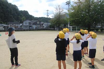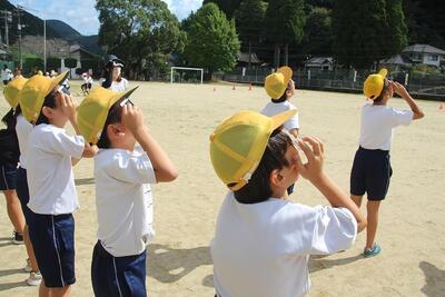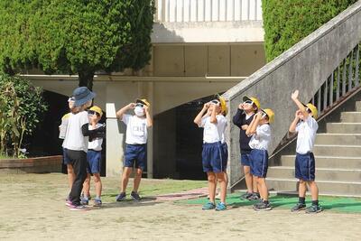 理科では、地面のようすと太陽という学習をしています。太陽と地面との関係について、日なたと日かげの地面の様子や太陽の位置とかげの位置の変化などを学習します。この日は、遮光板を使って太陽の位置を観察しました。遮光板を通して見える太陽は、まるで夜の空に光る満月のように見えました。雲に隠れる時間もあり、見えたときの3年生の「わあっ」という歓声は何とも言えません。