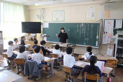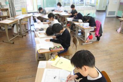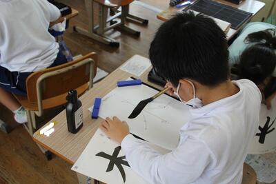 国語科の書写では、点やはねの筆使いに気をつけながら、「小」という文字を毛筆で書きました。3年生から始まった毛筆での学習にだんだん慣れてきました。筆圧に注意しながら一画一画丁寧に書きました。