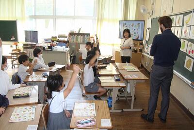 1学期最後の外国語活動では、ALTのA先生との最後の学習でした。A先生は3年間のALTの仕事を終え、母国に帰られることになりました。みんなで書いたメッセージカードを渡し、記念写真をとりました。A先生、ありがとうございました。