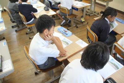 特別の教科道徳では、「うみねことたんぽぽ」という教材を使って、生命のもつ「生きる力」について考えました。この教材は、東日本大震災後の青森県蕪島(かぶしま)の自然の力強さから主人公たちが生きる力をよみがえらせる様子がえがかれています。東日本大震災を直接経験していない3年生ですが、当時の人たちの思いを想像し、自分の考えを伝え合いました。