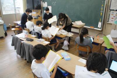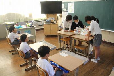 国語科では、「はんで意見をまとめよう」という学習を行いました。この学習では、1年生のために読み聞かせをする絵本を選ぶというテーマで意見を出し合いました。そして、グループで話し合い選んだ絵本を1年生に読み聞かせを行いました。どの絵本も自分たちで話し合って決めたものなので、3年生にとって価値があります。自分たちで役割分担をして、1年生が楽しんでくれるように工夫しました。