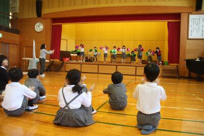 この日は、今月の歌「スマイルアゲイン」を歌い、リコーダーで「山のポルカ」を演奏しました。その後、東陽町文化の祭典のステージ発表で1・2年生が行う歌と合奏を見学しました。1・2年生が一生懸命行う発表に手拍子をして盛り上げました。