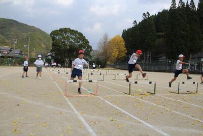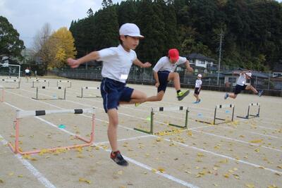 体育科では、8秒間のハードル走を行っています。一つのコースに4台のハードルを設置して、児童の走力にあったスタート位置から走り出し、8秒以内に走り切ったらスタート位置を後ろに1m下げていくというルールです。自分に合うハードル間の距離を選んだり、ハードルを跳びこす動きを工夫したりして、8秒間のハードル走を楽しんでいます。