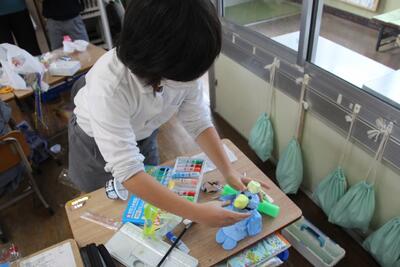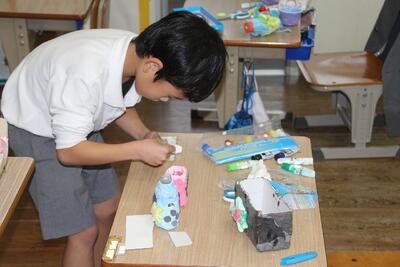 図工科では、空き容器と紙粘土の組み合わせを工夫し、形や色などの感じを捉えながら、生活の中で楽しく使えるものを作る学習をしています。空き容器を自分のイメージをふくらませていろんなものに見立て、紙粘土に絵の具で色をつけて練り込んで形を作っていきました。ステキな作品ができそうです。