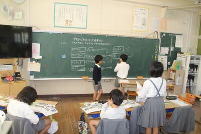 算数科では、「表とグラフ」について学習しています。この日は、ぼうグラフをかき、気づいたことについて話し合う学習をしました。「多い順番になっている」「階段のように見える」「違いがよく分かる」などの考えが出ました。ぼうグラフのよさについて学習リーダーを中心に学習できました。