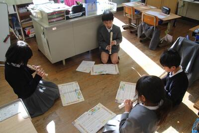 3年生になって新しく学習することの一つにリコーダーがあります。音楽科の授業では、リコーダーの演奏の仕方について学習しました。指の使い方や息の吹き方・姿勢などに気をつけて演奏しました。まずは「シ・ラ・ソ」できれいな音を出そうとがんばる3年生です。