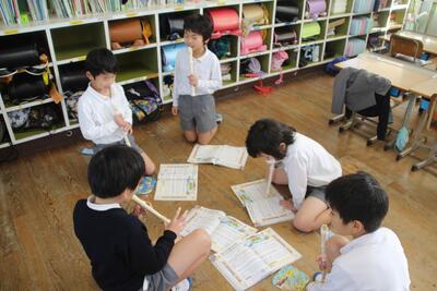 音楽科では、2拍子にのって楽器を演奏する学習を始めました。「ゆかいな木きん」では、リコーダーやけんばんハーモニカなどに分かれて練習をしました。みんなで音楽を作る一体感を味わいます。