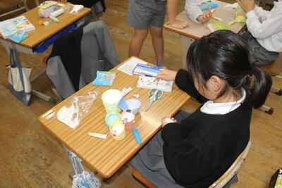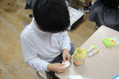 図工科では、空き容器と紙粘土の組み合わせを工夫し、形や色などの感じを捉えながら、生活の中で楽しく使えるものを作る学習を行いました。紙粘土に絵の具で色をつけて練り込んで、自分がイメージするものを作りました。いろんな模様をつけたり、モールを飾ったりしながら、ステキな作品が完成しました。