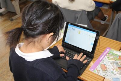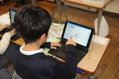 社会科では、先日まちの様子を見学して、タブレットPCにまとめていきました。Gマップを使って位置を把握し、自分が調べたところを入力しました。便利なアプリケーションソフトがあるので、地図記号を使うのを忘れてしまいそうです。
