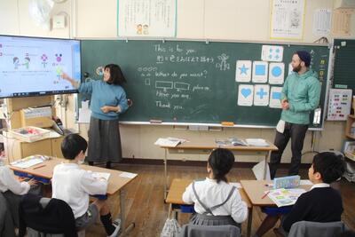 外国語活動では、形の言い方や、欲しいものを尋ねたり答えたりする学習をしています。この日は、色の形を集め、グリーティングカード(季節のあいさつカード)を作る活動を行いました。デジタル教科書の音声やALTのJ先生の発音を聞き取り、色の形を作りました。