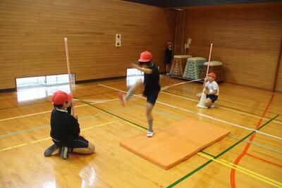 体育科では、走り高とびの学習をしています。助走・踏切・空中姿勢・着地などの体の動きについて、自分のめあてを立てて活動をしています。足の振り上げ方や助走角度について自分たちで学び合っています。授業の終わりには、自分や友達のがんばりを伝え合っています。